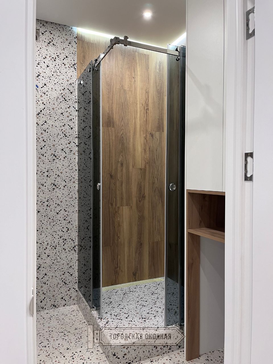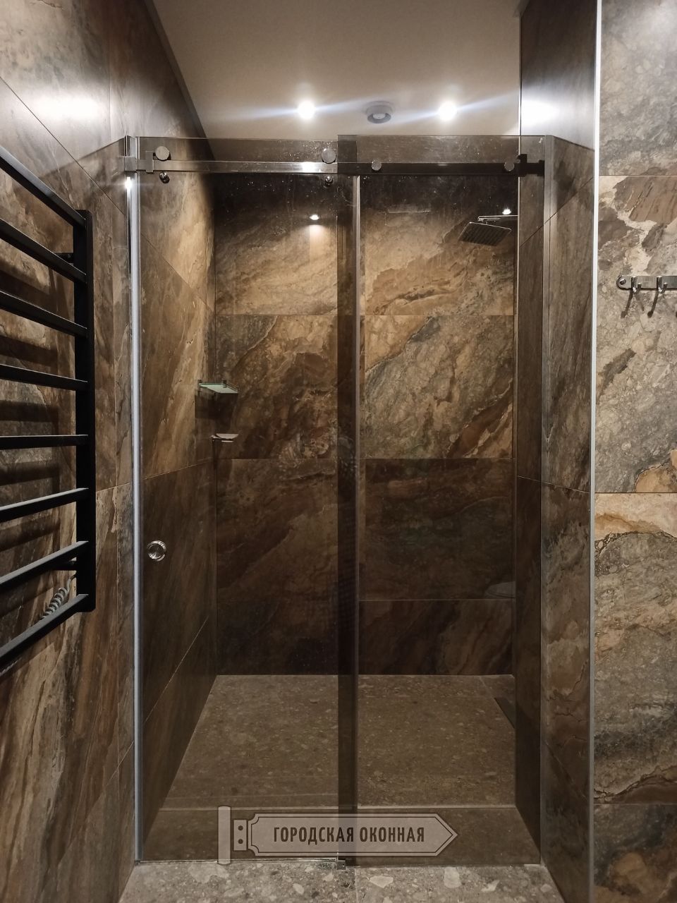 У цю категорію входять скляні душові перегородки з дверима, призначені для монтажу в облицьовану керамічною плиткою нішу. У разі розстібних, можливе рішення - це двері з боковим заплечиком. Також, можлива перегородка із самої стулки дверей або двох (орні половинки або «книжка»). Стулки можуть мати зовнішнє відкривання або внутрішнє. Стандартно, використовуються пружинні петлі з функцією доводчика. ОБЕРЕЖНО! На ринку вже багато підробок, які розчарують вас своїм терміном служби. Для комфортної фіксації закритого положення на торець стулки та скла у відповідь встановлюється магнітний ущільнювач. Душова перегородка може бути реалізована і з розсувними дверима. В основному нашими спеціалістами використовується система зовнішніх роликів на квадратній напрямній трубі. Товщина стін труби 10х30 завжди не менше 1,5 мм!