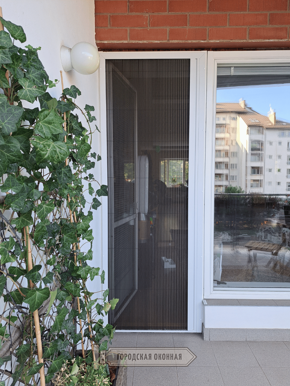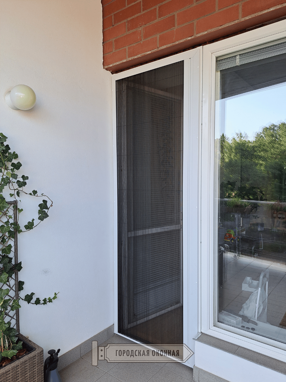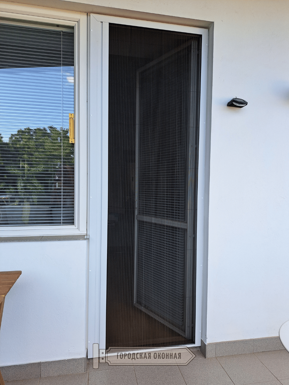 Плісе - найбільш оригінальна із систем антимоскітних сіток. Має імідж дверних сіток преміум-класу та була розроблена в Італії. Складається з алюмінієвої профільної системи та спеціального полотна сітки від фірми Pfeiffer. Система компактна, хоч і досить складна у своїй будові. Вона має високу стійкість та ані протяги, ані буревій їй не завдают шкоди. У будь-якому положенні, тобто відкритому, закритому або напівзакритому, забезпечується надійна фіксація керуючого профілю-ручки з магнітною стрічкою. Також, у складеному стані конструкція чудово переносить зимовий сезон, займаючи на вікні мінімум місця та мінімально забруднюючись. Профіль порога висотою 5 мм доповнює переваги, і очевидно, що цей різновид саме для дверей на балкон або терасу значно перевершує рамну сітку.