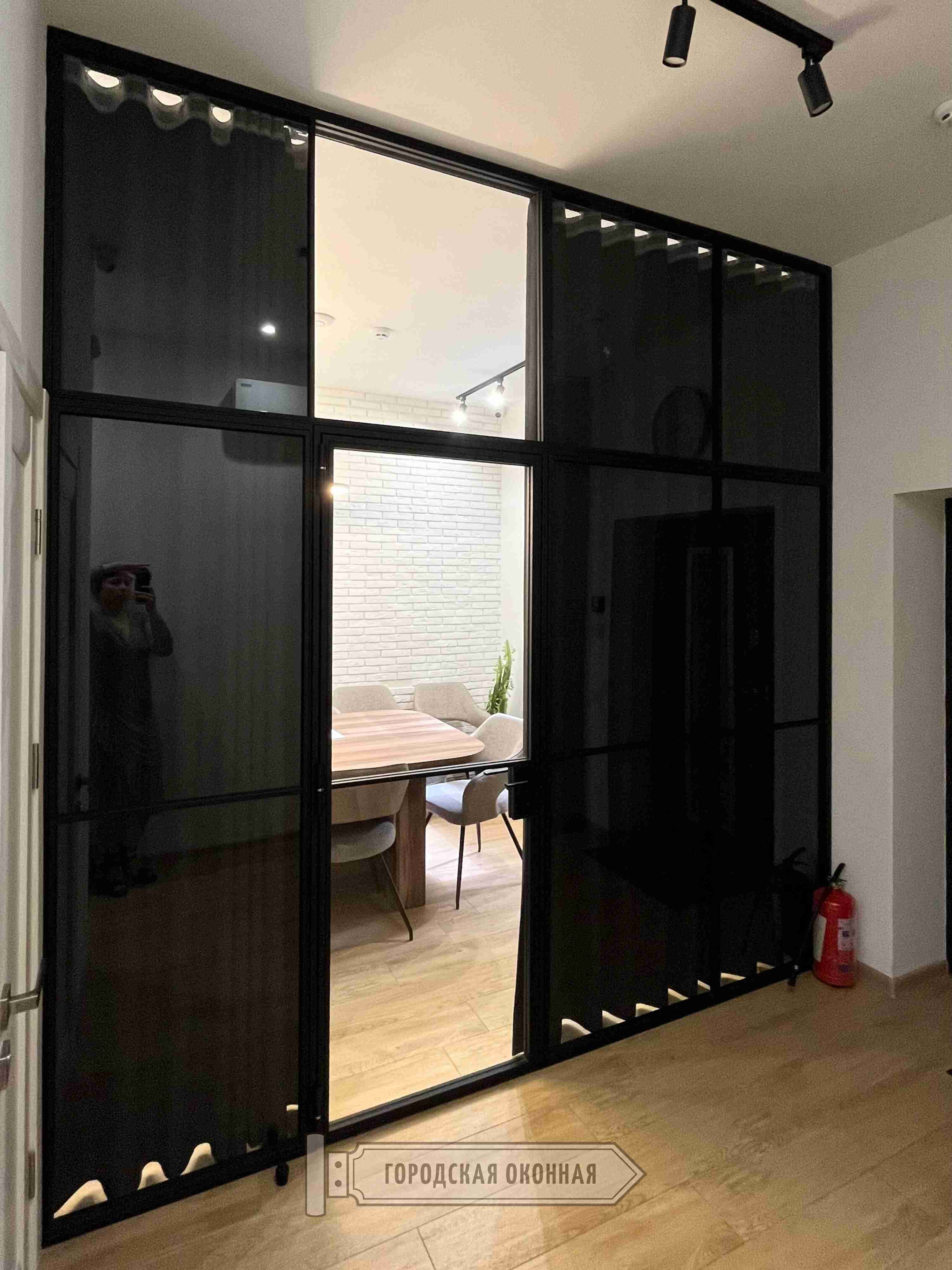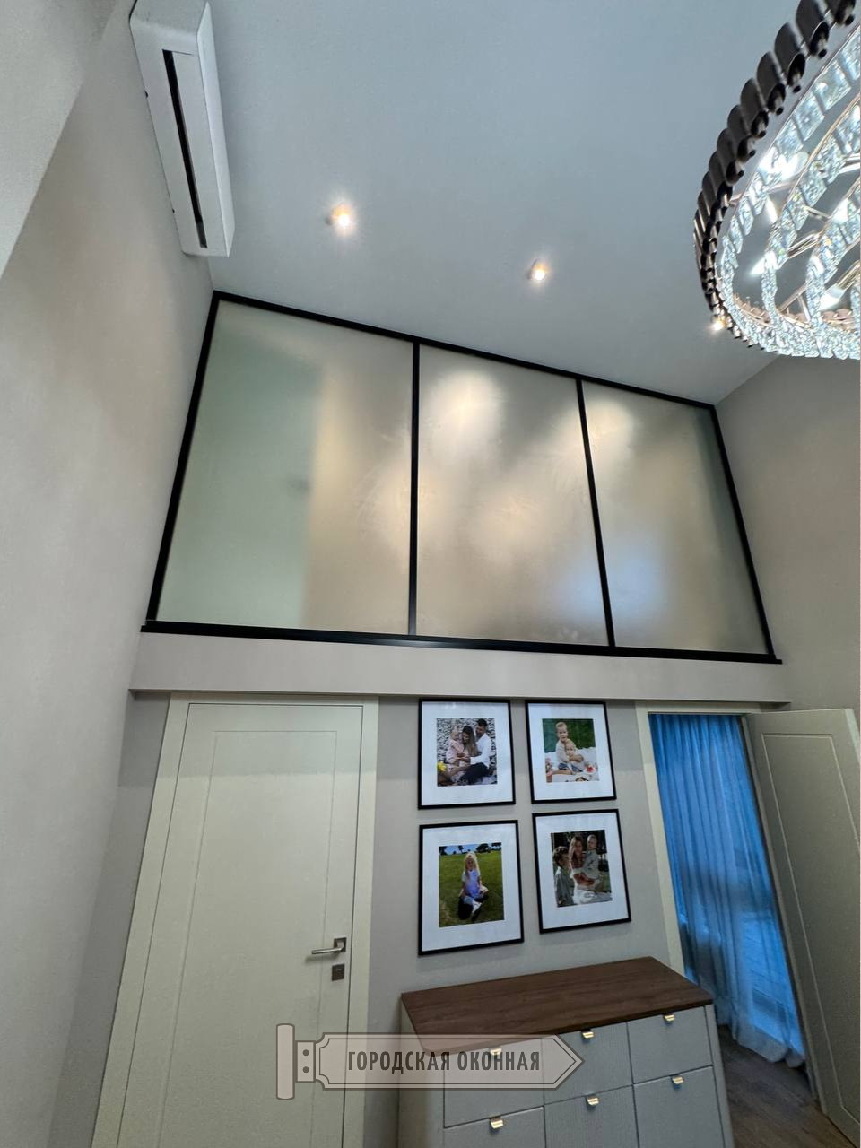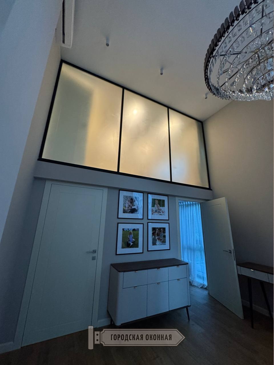 Максимально концептуальное изделие! По нашему опыту, интерьерное окно может иметь сравнительно скромные размеры а, при этом, его дизайн и функционал наоборот являться центром всеобщего внимания. Главная функция — поступление света. Мы исполняем как с открыванием, так и без. Монтируется в заранее подготовленный «чистовой» проем. Применим диапазон дизайнерских стекол толщиной 4 мм. Применяем и закаленное стекло 6 мм (матовое, прозрачное, тонированное). Разделение на сектора может быть реализовано при помощи профильной трубы 10х10 мм, или наклеенной с двух сторон полосы шириной 20 мм.