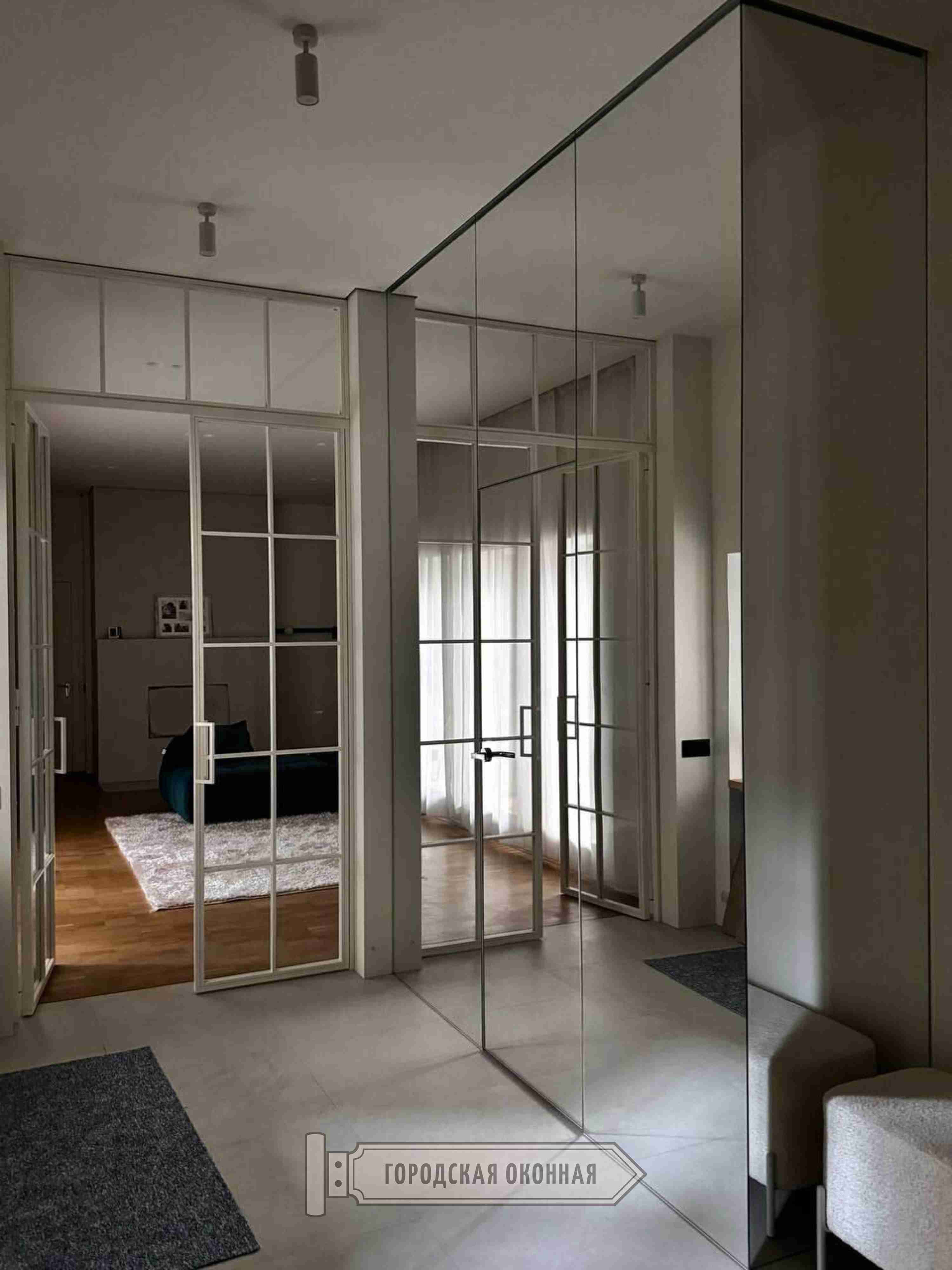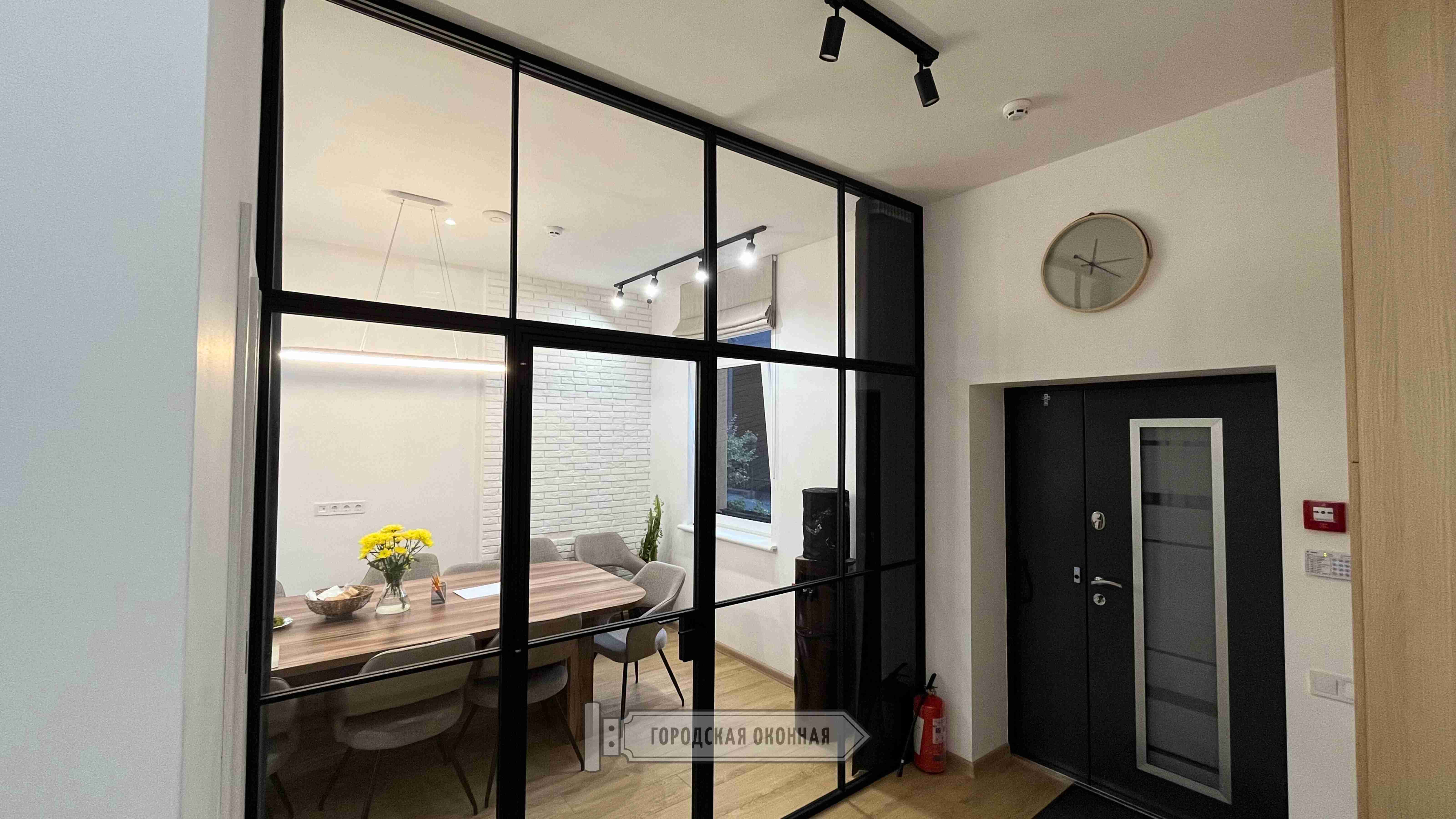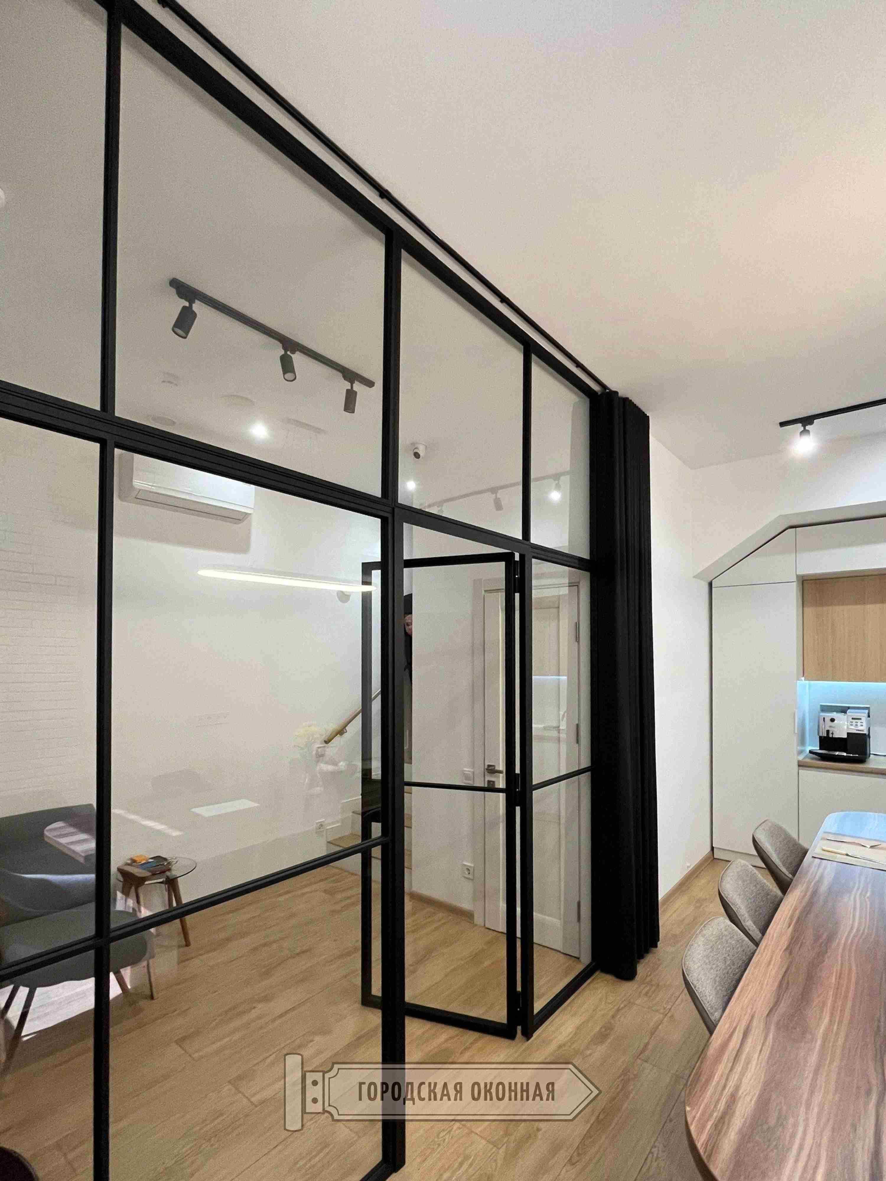Максимально концептуальное изделие! По нашему опыту, интерьерное окно может иметь сравнительно скромные размеры а, при этом, его дизайн и функционал наоборот являться центром всеобщего внимания. Главная функция — поступление света. Мы исполняем как с открыванием, так и без. Монтируется в заранее подготовленный «чистовой» проем. Применим диапазон дизайнерских стекол толщиной 4 мм. Применяем и закаленное стекло 6 мм (матовое, прозрачное, тонированное). Разделение на сектора может быть реализовано при помощи профильной трубы 10х10 мм, или наклеенной с двух сторон полосы шириной 20 мм.
