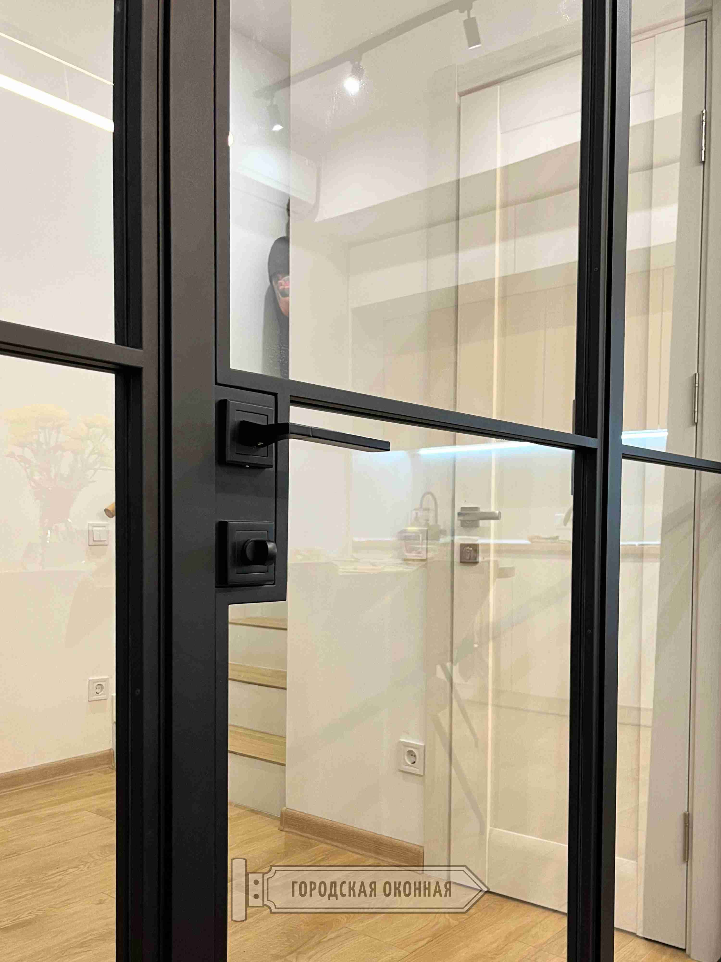 Базовый комплект дверей LOFT соответствует классике: нажимная ручка, магнитная или стандартная защелка. Они являются частью перегородки с распашной дверью. Существенное преимущество конструкций с дверями из стекла и металла в том, что они выглядят довольно изящно даже при больших габаритах. Отдельно такую дверь можно установить как на входе в офисный кабинет, так и в санузел. Выбор заполнения позволяет сделать дверь частично или полностью непрозрачной.