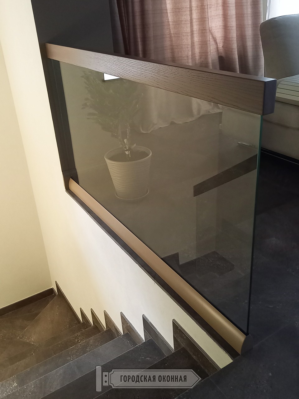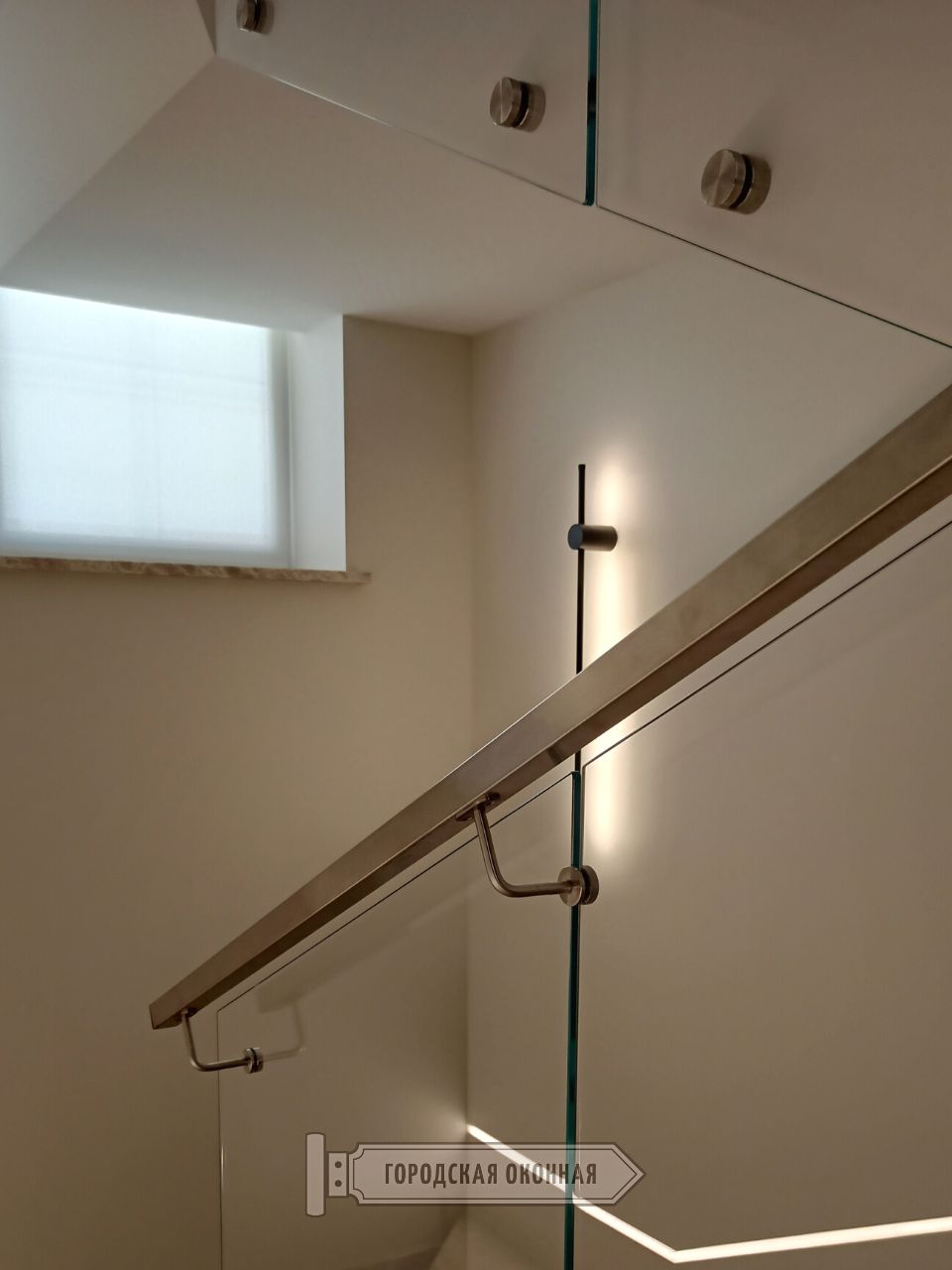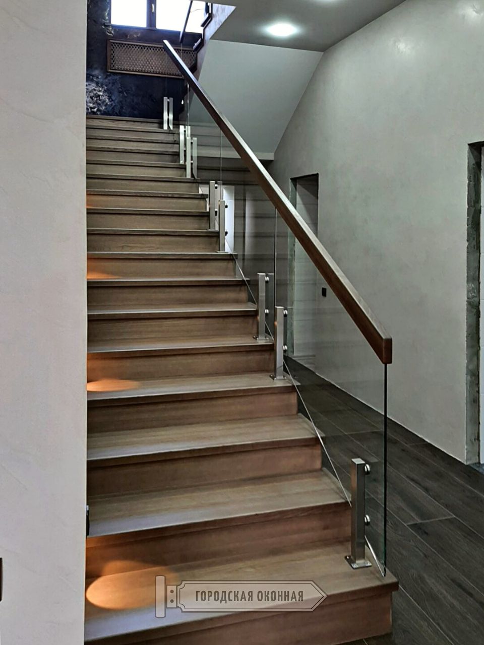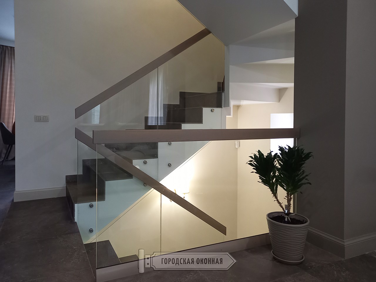 Важлива перевага скляних перил це прозорість конструкції. Сонячне світло безперешкодно проникає через захисні екрани сходів, створюючи легкий образ усього приміщення, не захаращеного сходами. Але також, якщо сходи компактні, і сприймаються вами виключно в стилі мінімалізму, то панелі із загартованого скла (товщина 10-12 мм), які виступають несучим елементом з монтажем збоку, утворять потрібне відчуття легкої, але все ж таки міцної та надійної, конструкції огорожі.