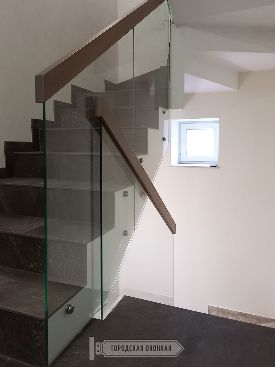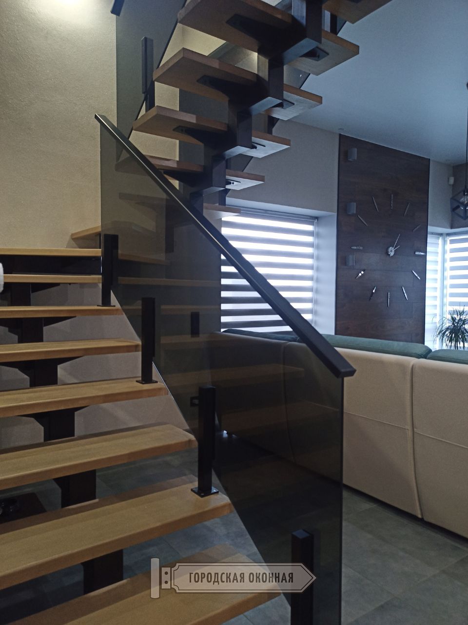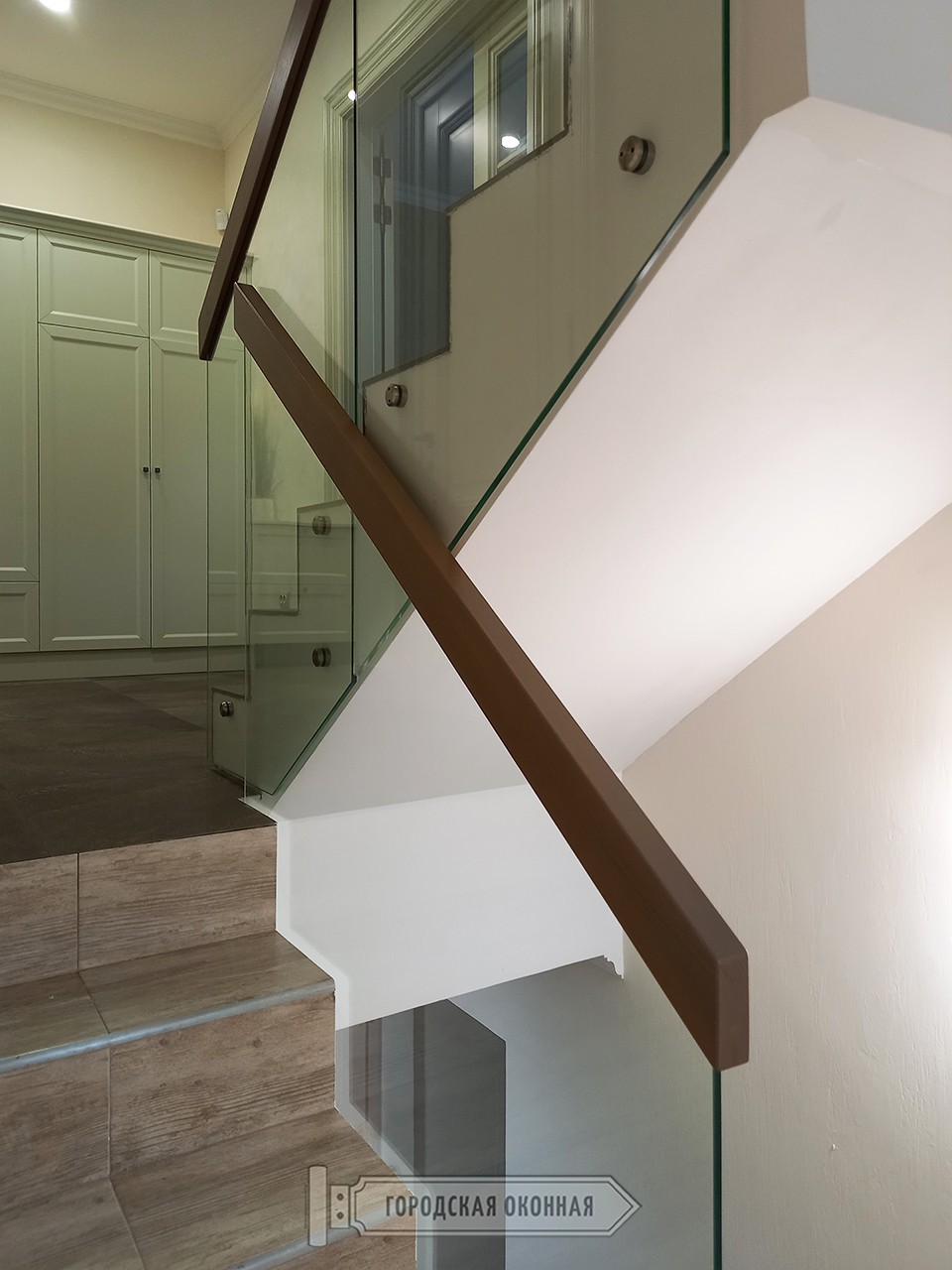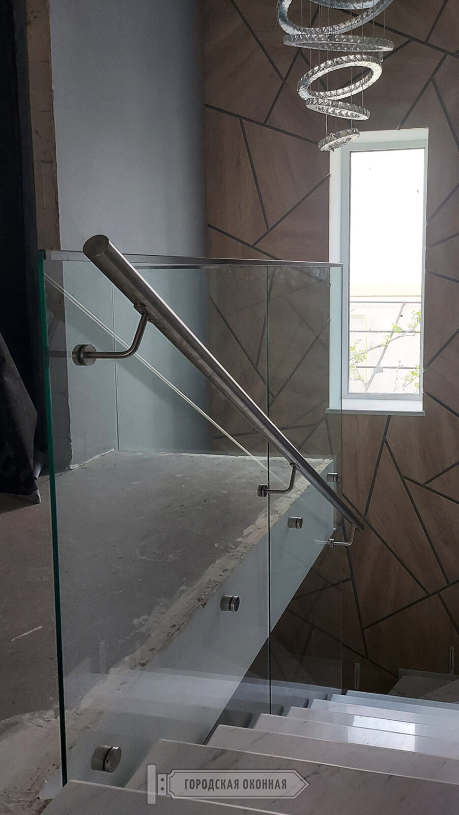 Важлива перевага скляних перил це прозорість конструкції. Сонячне світло безперешкодно проникає через захисні екрани сходів, створюючи легкий образ усього приміщення, не захаращеного сходами. Але також, якщо сходи компактні, і сприймаються вами виключно в стилі мінімалізму, то панелі із загартованого скла (товщина 10-12 мм), які виступають несучим елементом з монтажем збоку, утворять потрібне відчуття легкої, але все ж таки міцної та надійної, конструкції огорожі.