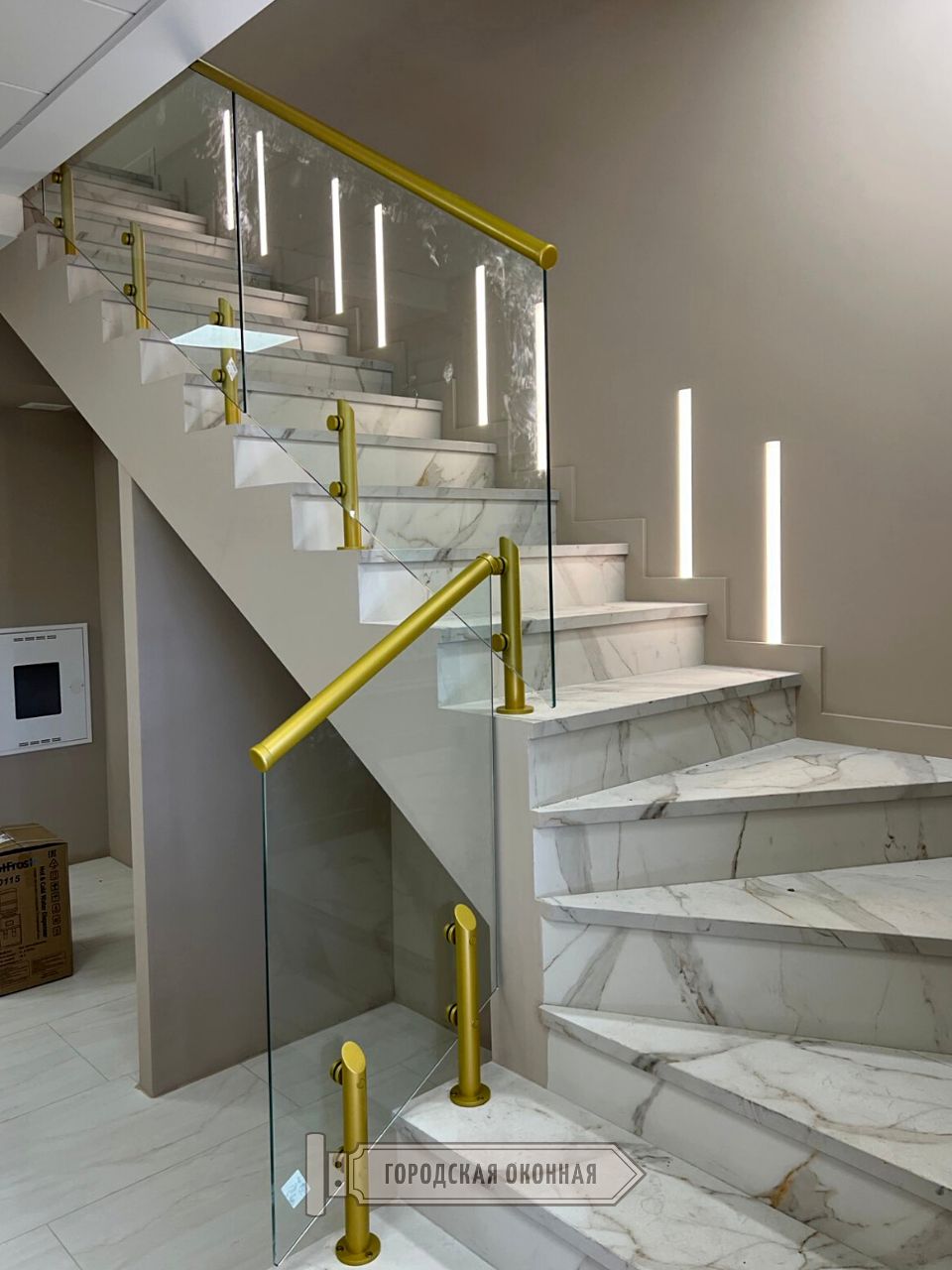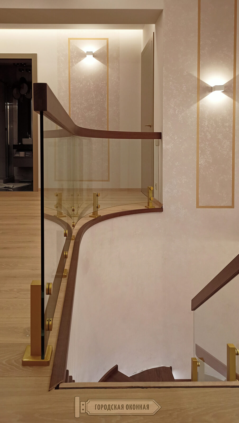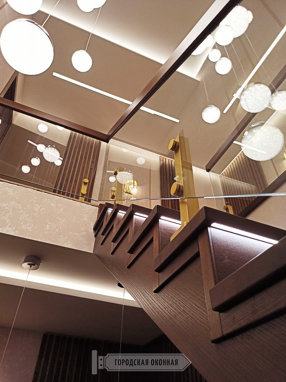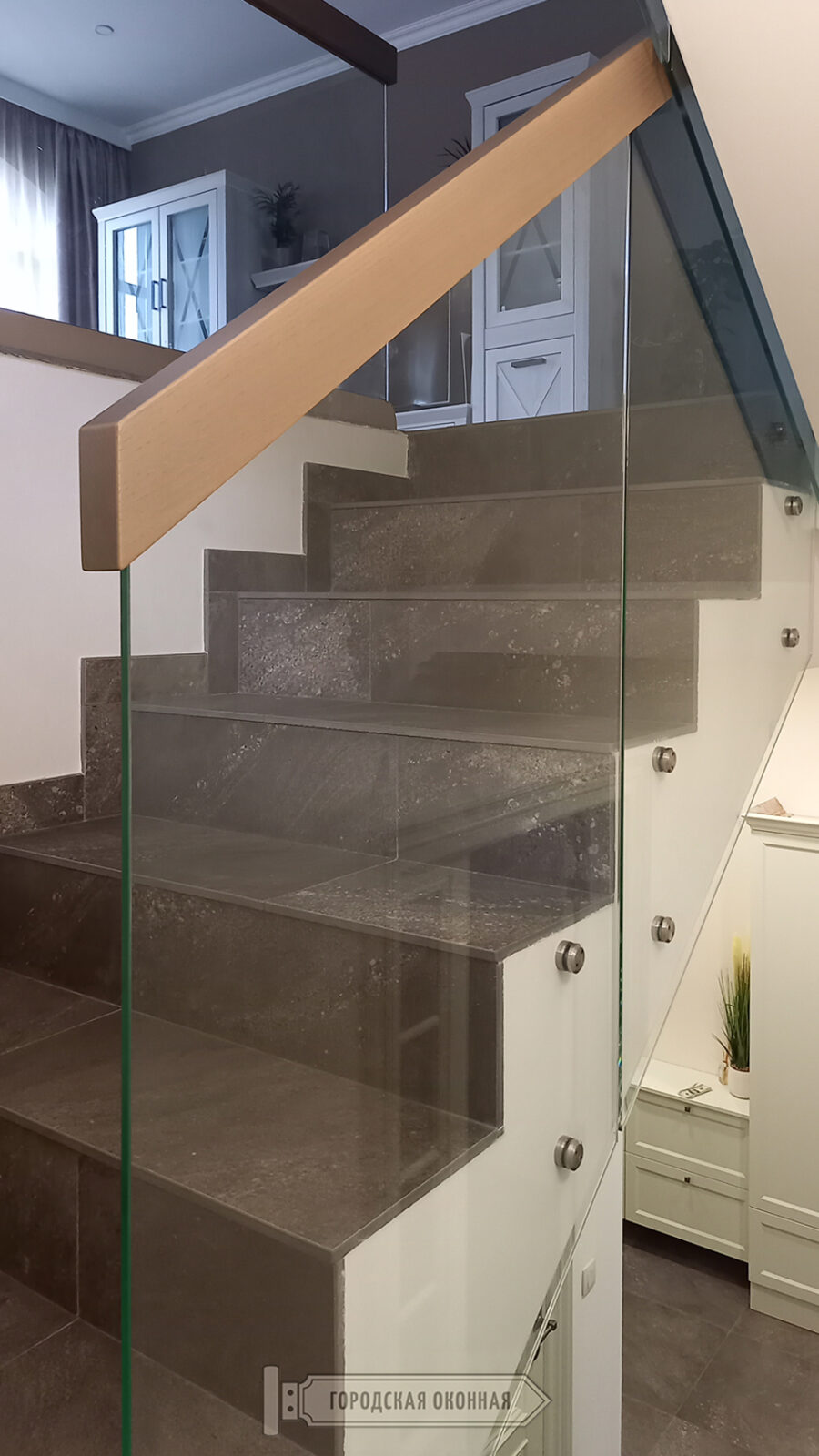 Важлива перевага скляних перил це прозорість конструкції. Сонячне світло безперешкодно проникає через захисні екрани сходів, створюючи легкий образ усього приміщення, не захаращеного сходами. Але також, якщо сходи компактні, і сприймаються вами виключно в стилі мінімалізму, то панелі із загартованого скла (товщина 10-12 мм), які виступають несучим елементом з монтажем збоку, утворять потрібне відчуття легкої, але все ж таки міцної та надійної, конструкції огорожі.