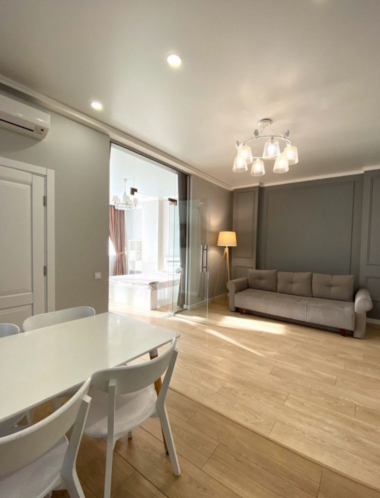 На фото: БЕЗРАМНА МІЖКІМНАТНА ПЕРЕГОРОДКА з прозорим загартованим склом 10 мм. Розсувні двері стандартної висоти закріплені на верхній рейці, яка змонтована безпосередньо на стаціонарній скляній частині конструкції. Рейка декорується акуратною ергономічною накладкою, яка відмінно вписується в дизайн скляної перегородки. Накладка і обрамляючий п-профіль конструкції з анодованого алюмінію.