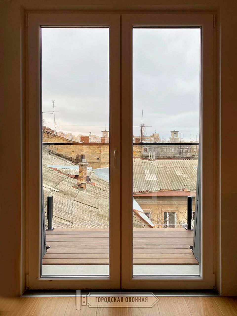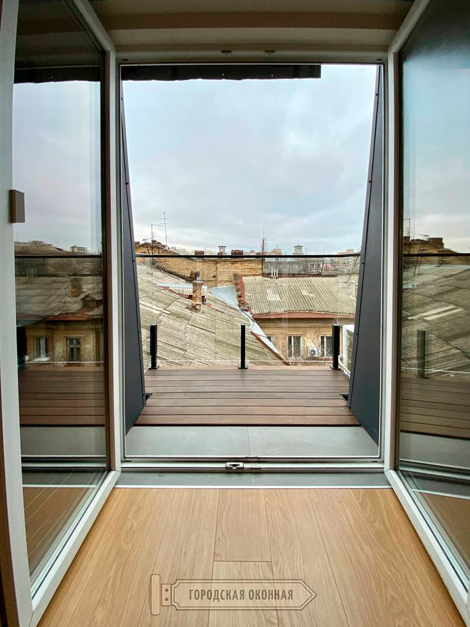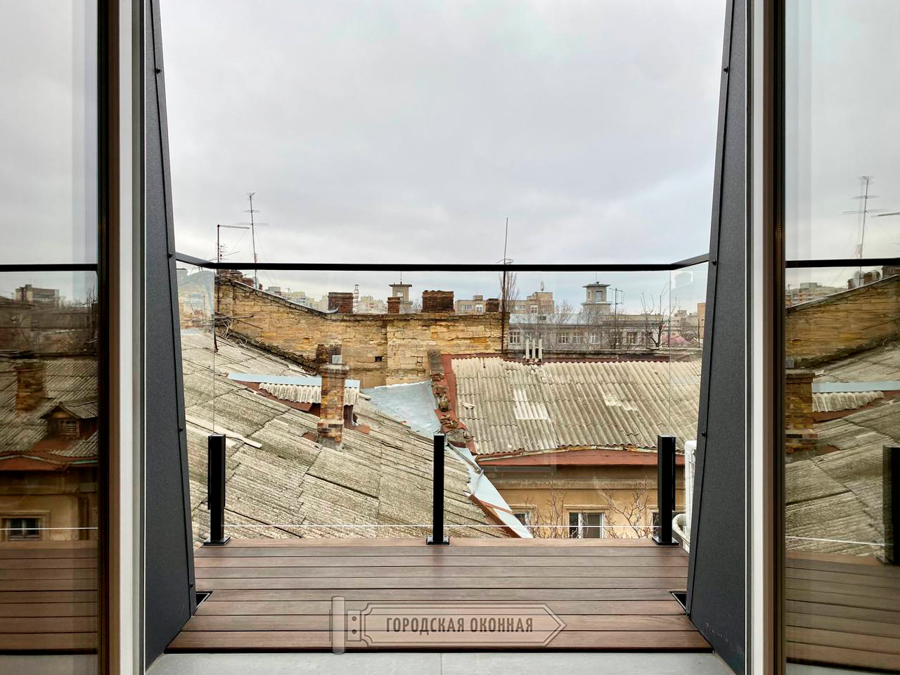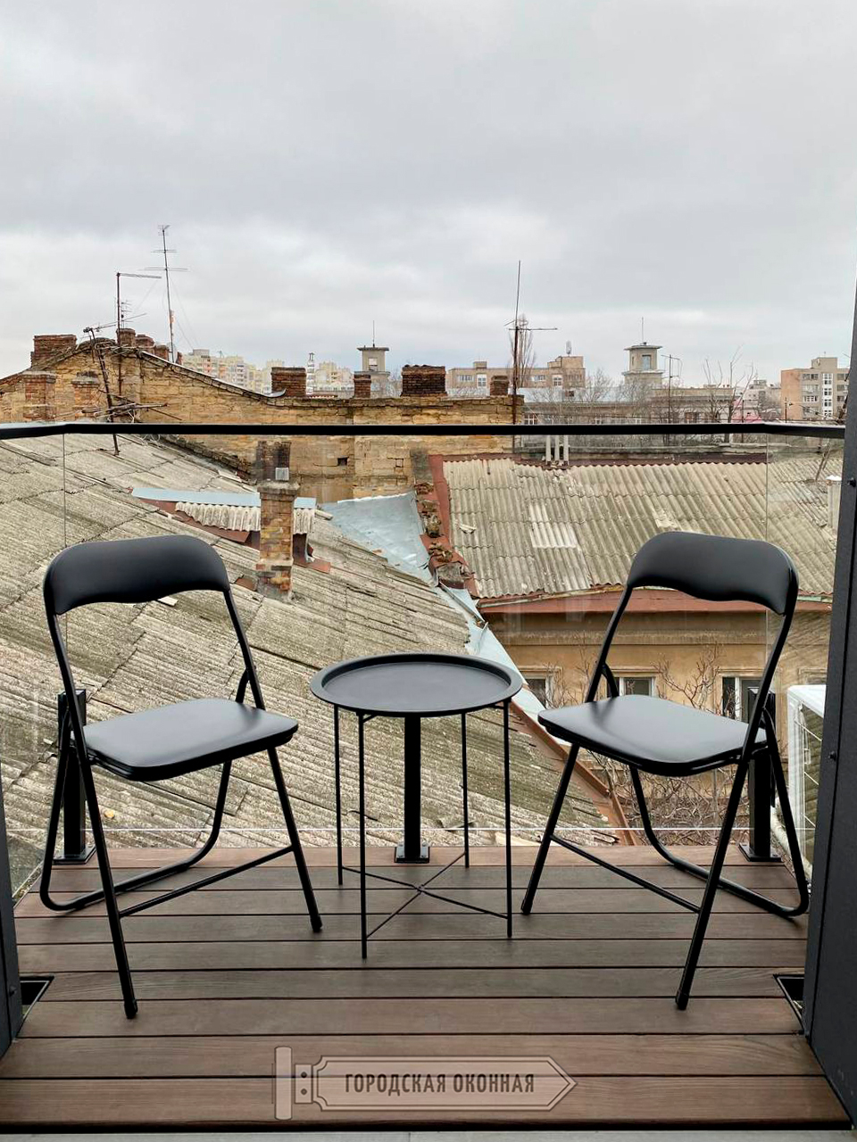 Чудовий зразок реалізації балкона в стилі ЛОФТ. Тобто зовнішнього об'єкта, але який є невід'ємною частиною цієї затишної квартири. З кухні-студії на балкон виводять просторі двостулкові двері, а штори або тюль тут за задумом відсутні. І навіть у холодну пору року, коли більш кортить бути всередині і насолоджуватись затишком, господарі можуть не припиняти милуватися як своїм стильним балконом із прозорою скляною огорожею, так і старим містом із його мʼяким колоритом. А це поєднання дійсно наштовхує на філософські думки!