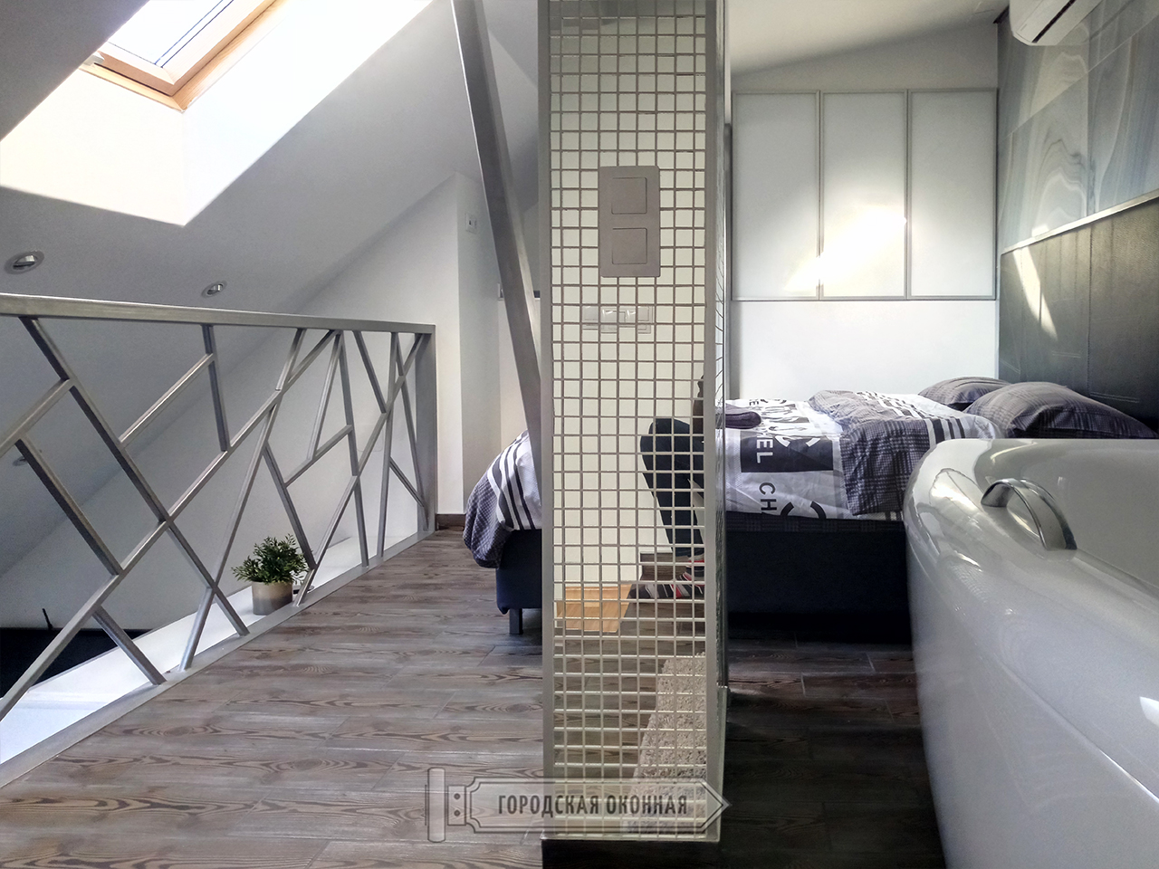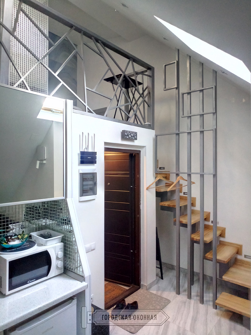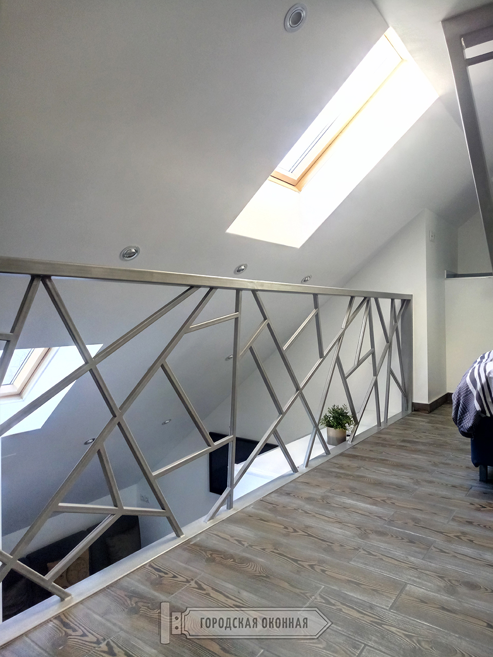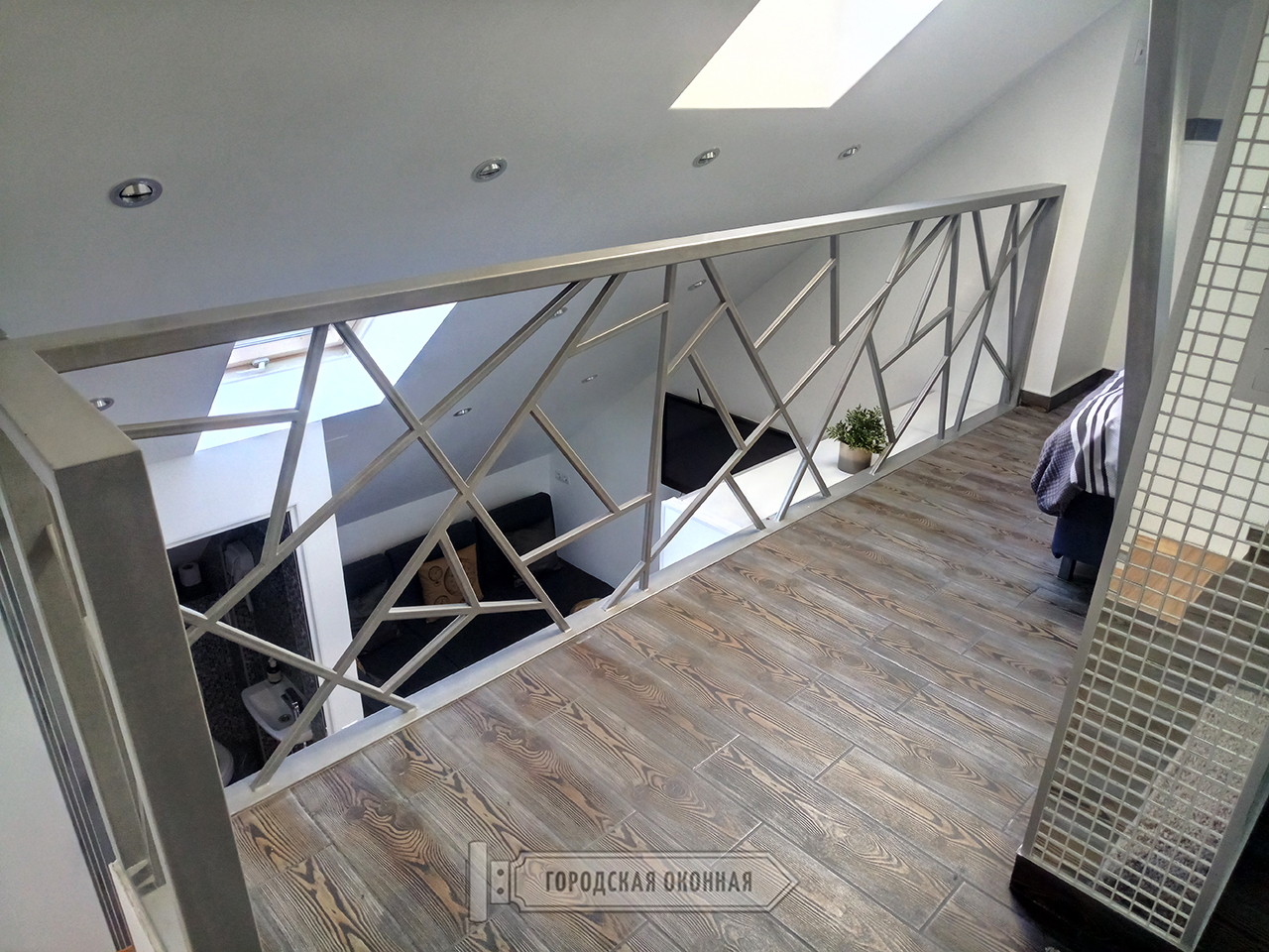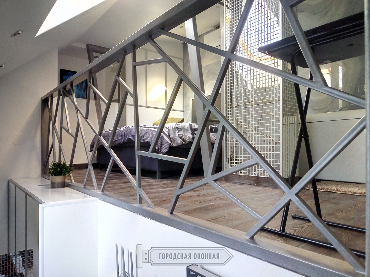 Необхідно було запропонувати для оригінальної квартири з атріумом варіант огороджувальної конструкції для самого «балкону» і прилеглих до нього сходів, з умовою ніде не зменшити простір і створити повноцінне відчуття безпеки у верхній спальній зоні. Сама огорожа максимально невибаглива, що ідеально підходить під комерційні цілі. А стиль, якого було вирішено дотримуватися, повністю відповідає тренду виконання найпрестижніших і найсучасніших апартаментів.